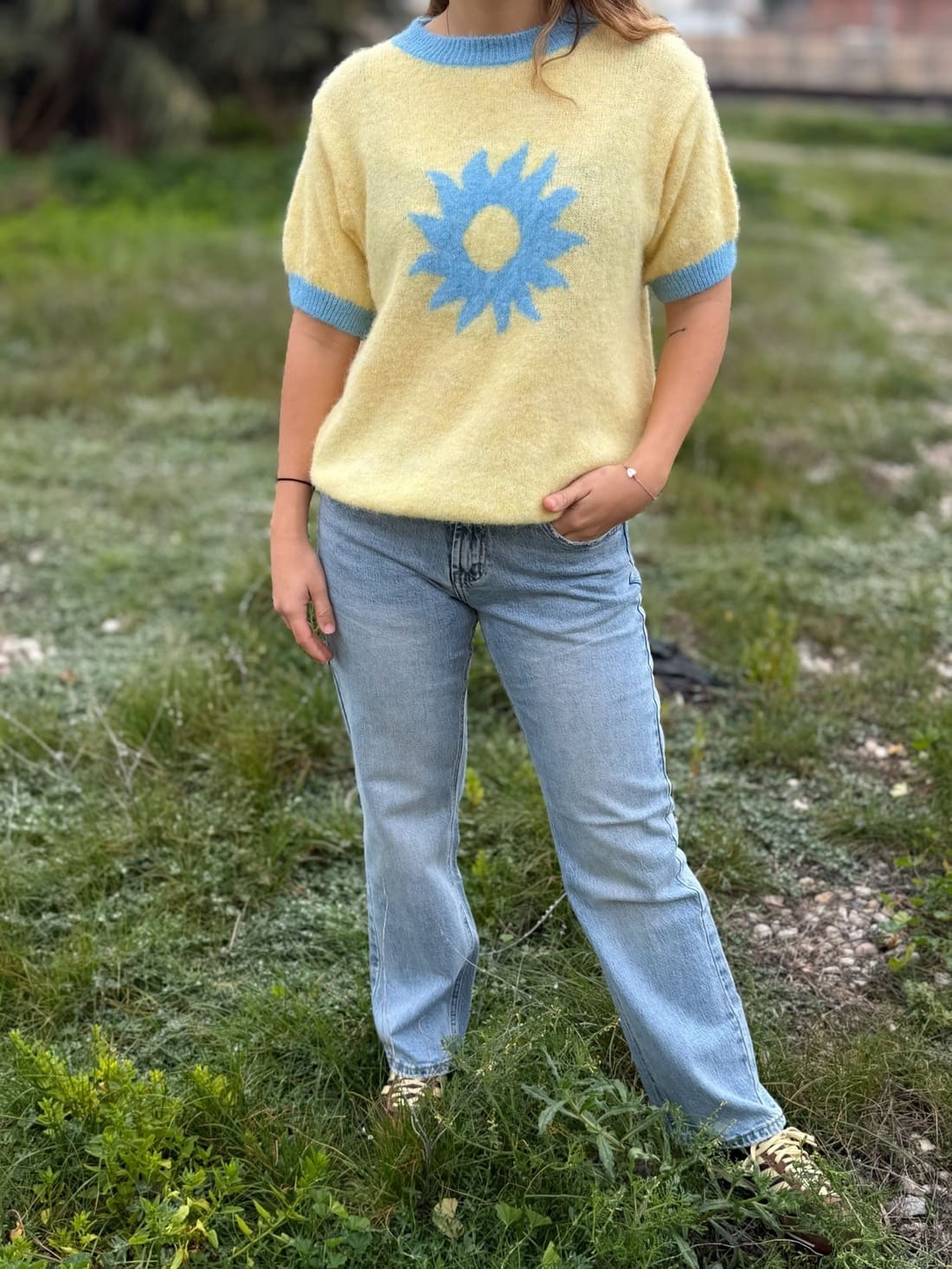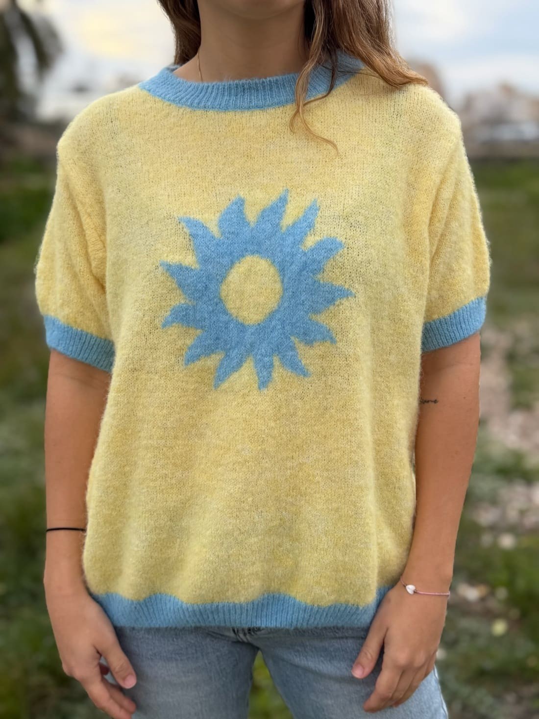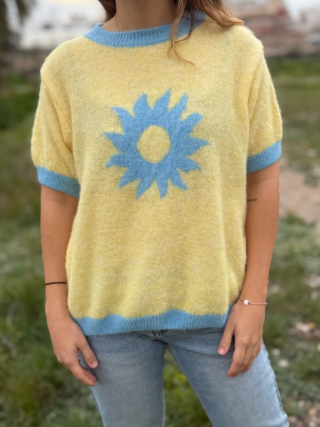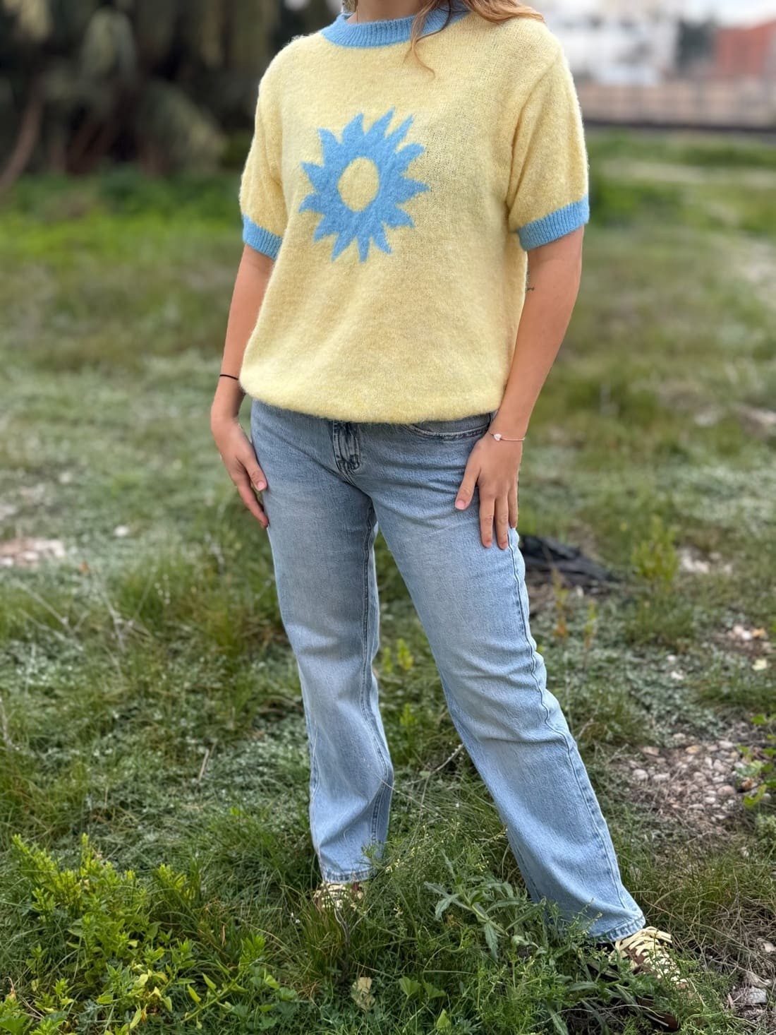 Tiene detalle de una flor en color azul al igual que los filos. Es un jersey muy dulce y la combinación de colores es ideal.