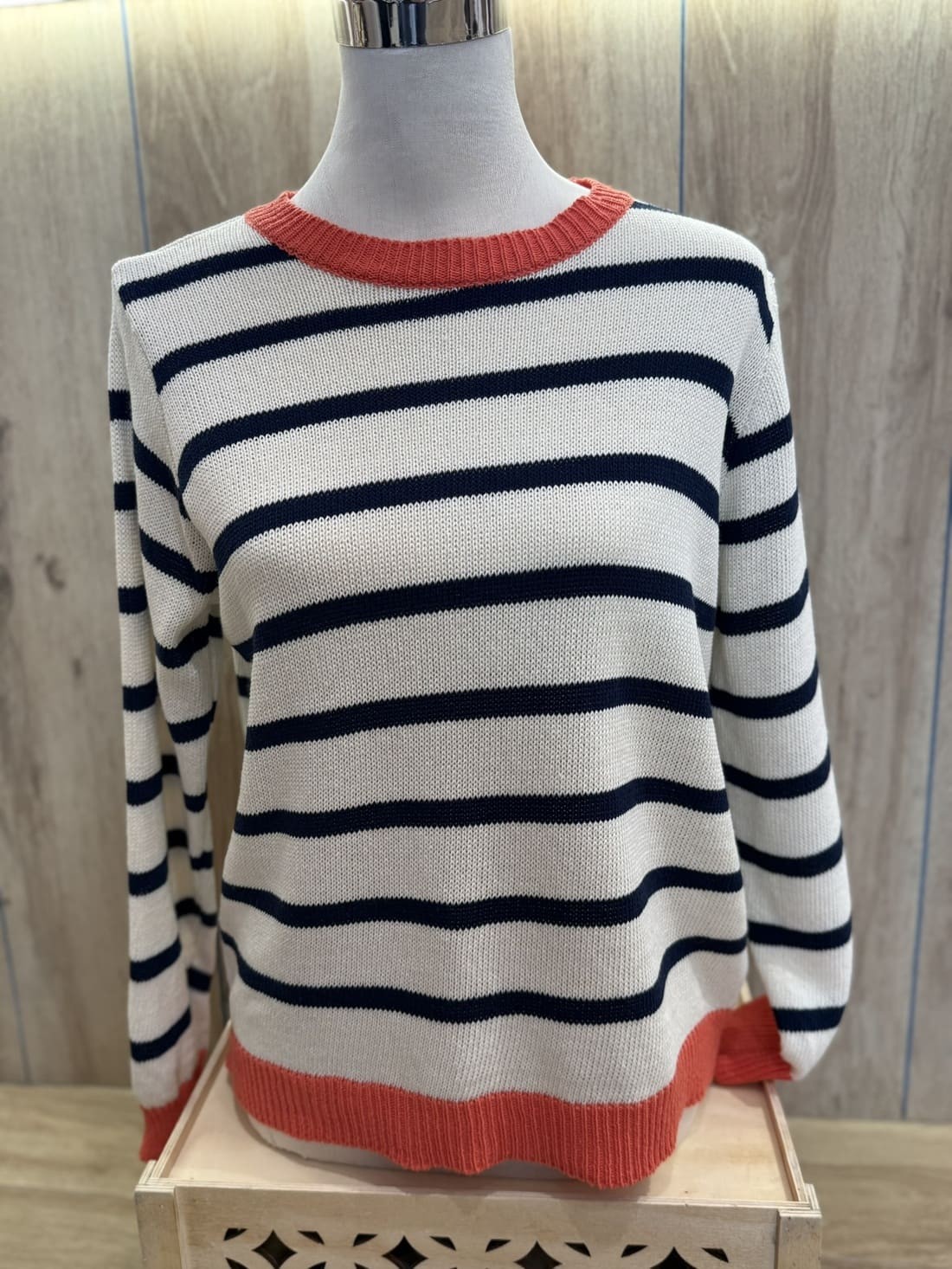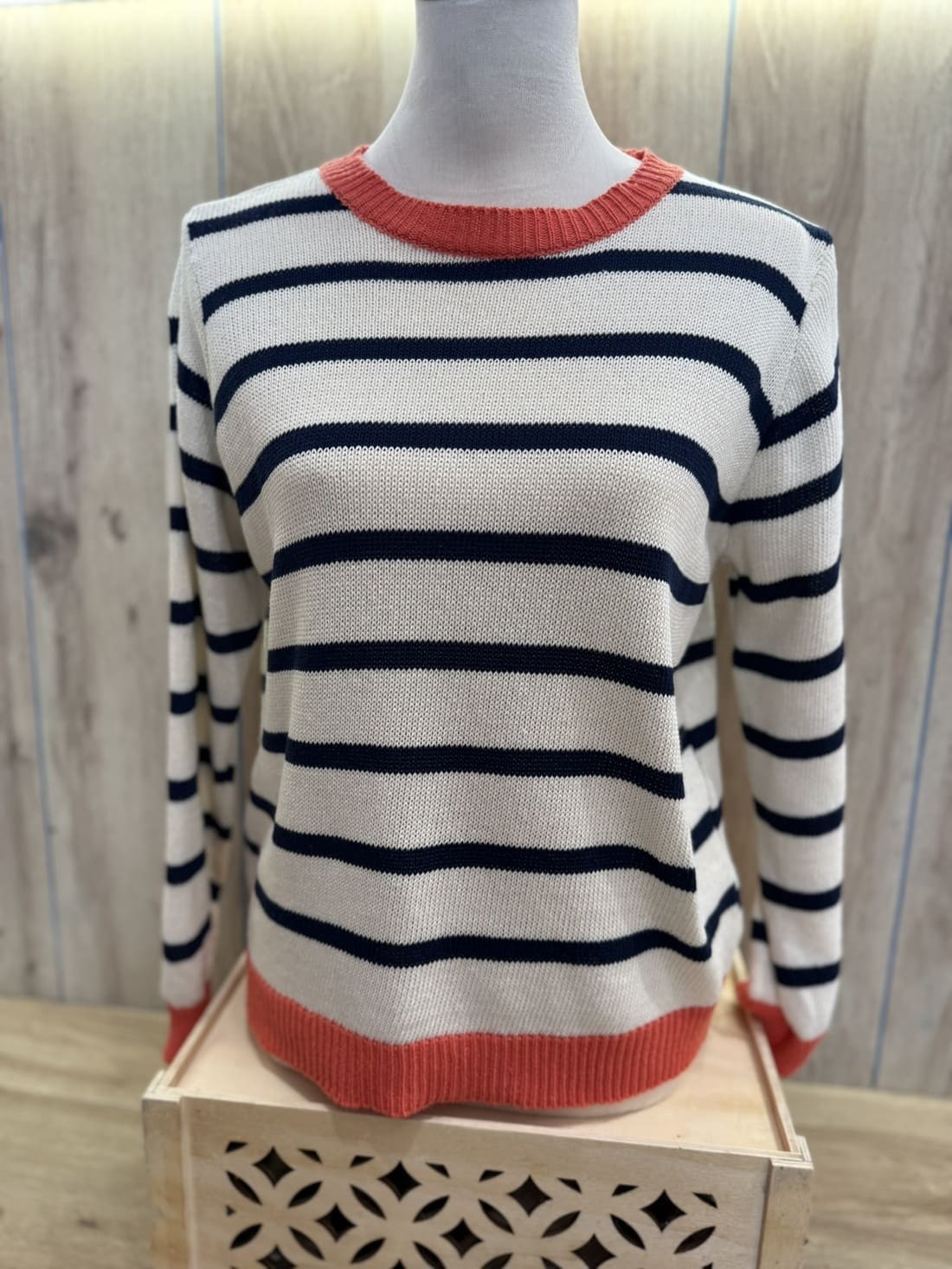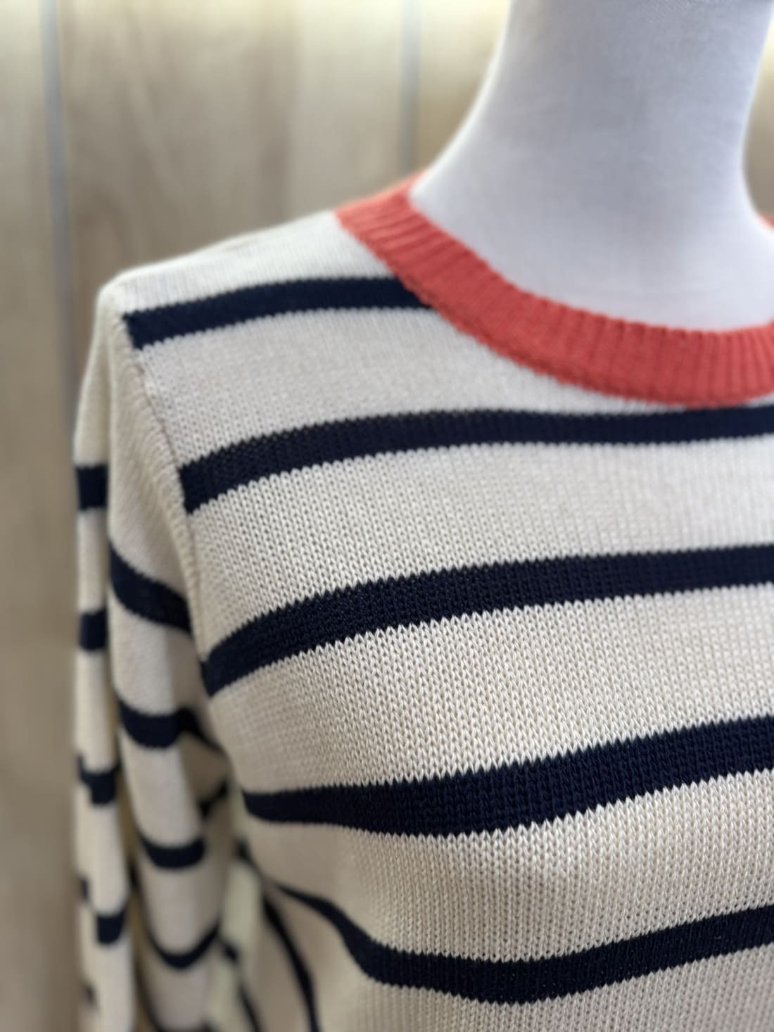 Jersey de rayas horizontal en dos colores, azul marino y blanco roto. Es de cuello redondo.