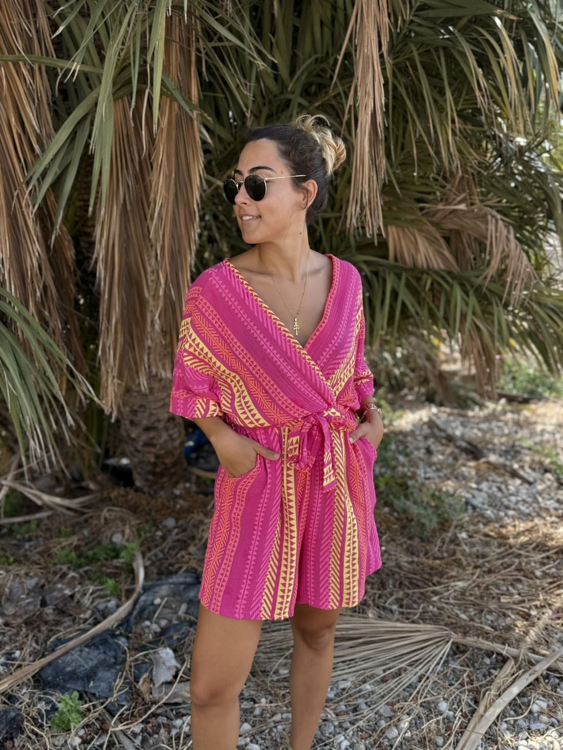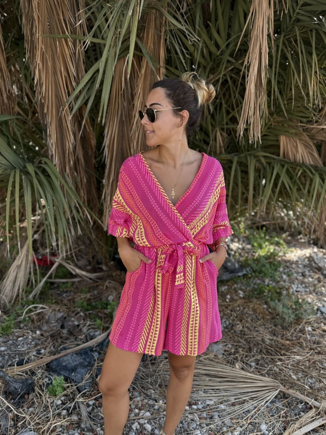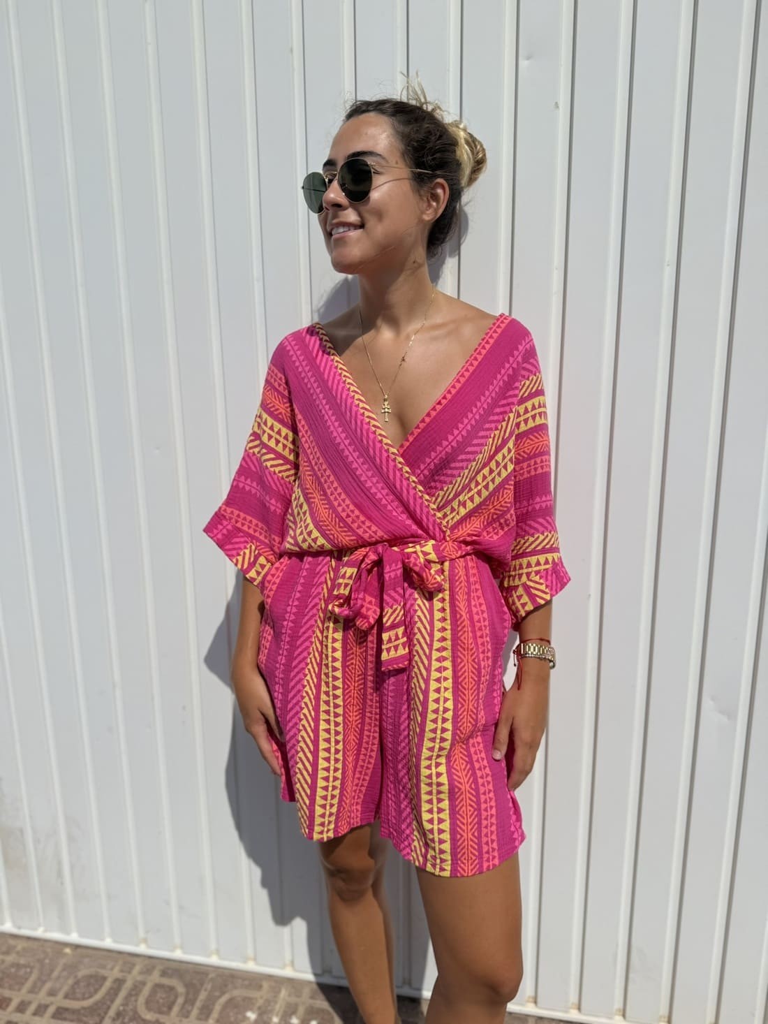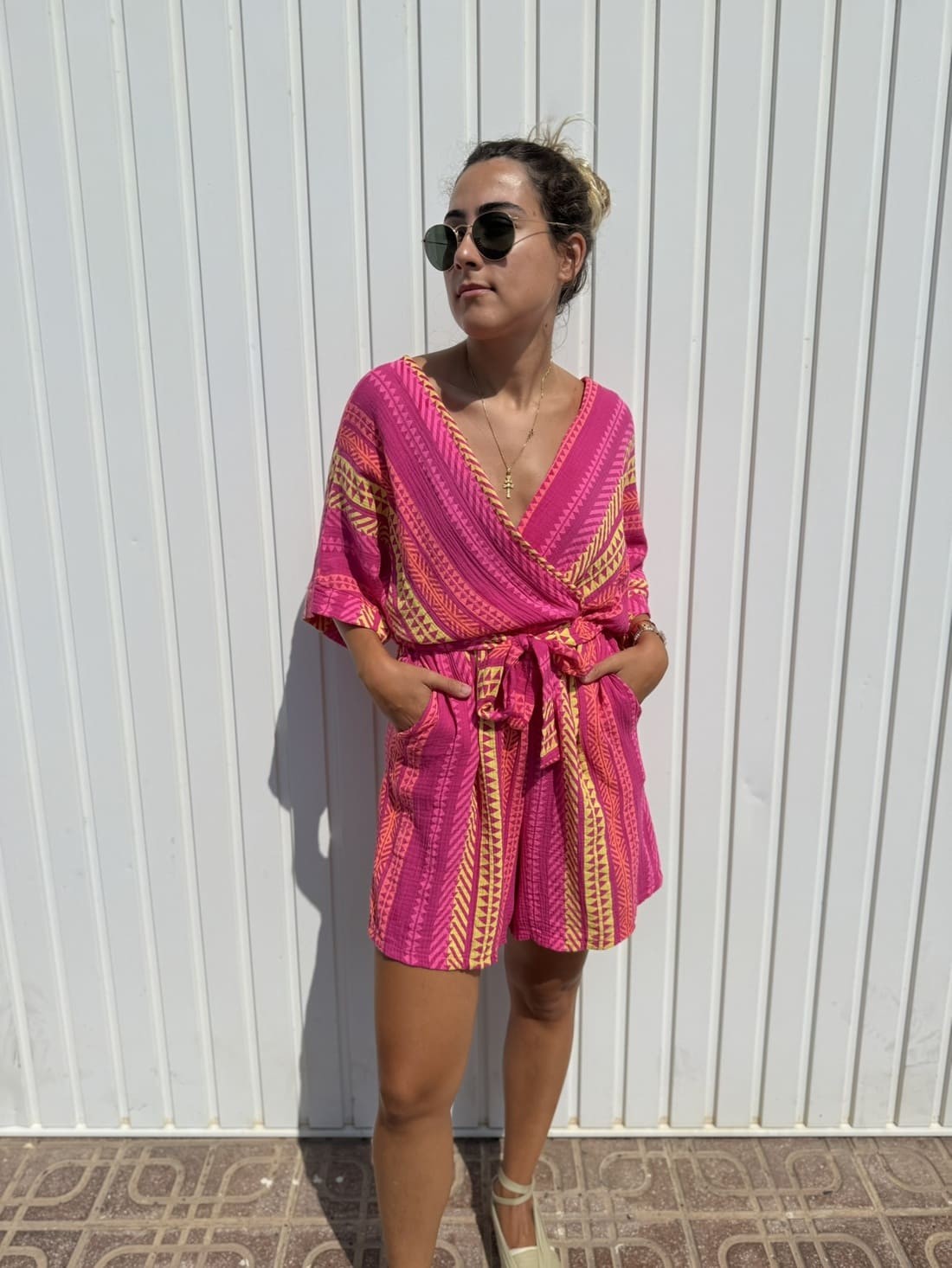 Mono corto de manga corta de murciélago con volantito al final de esta. Su escote es cruzado que queda muy bonito y favorecedor.