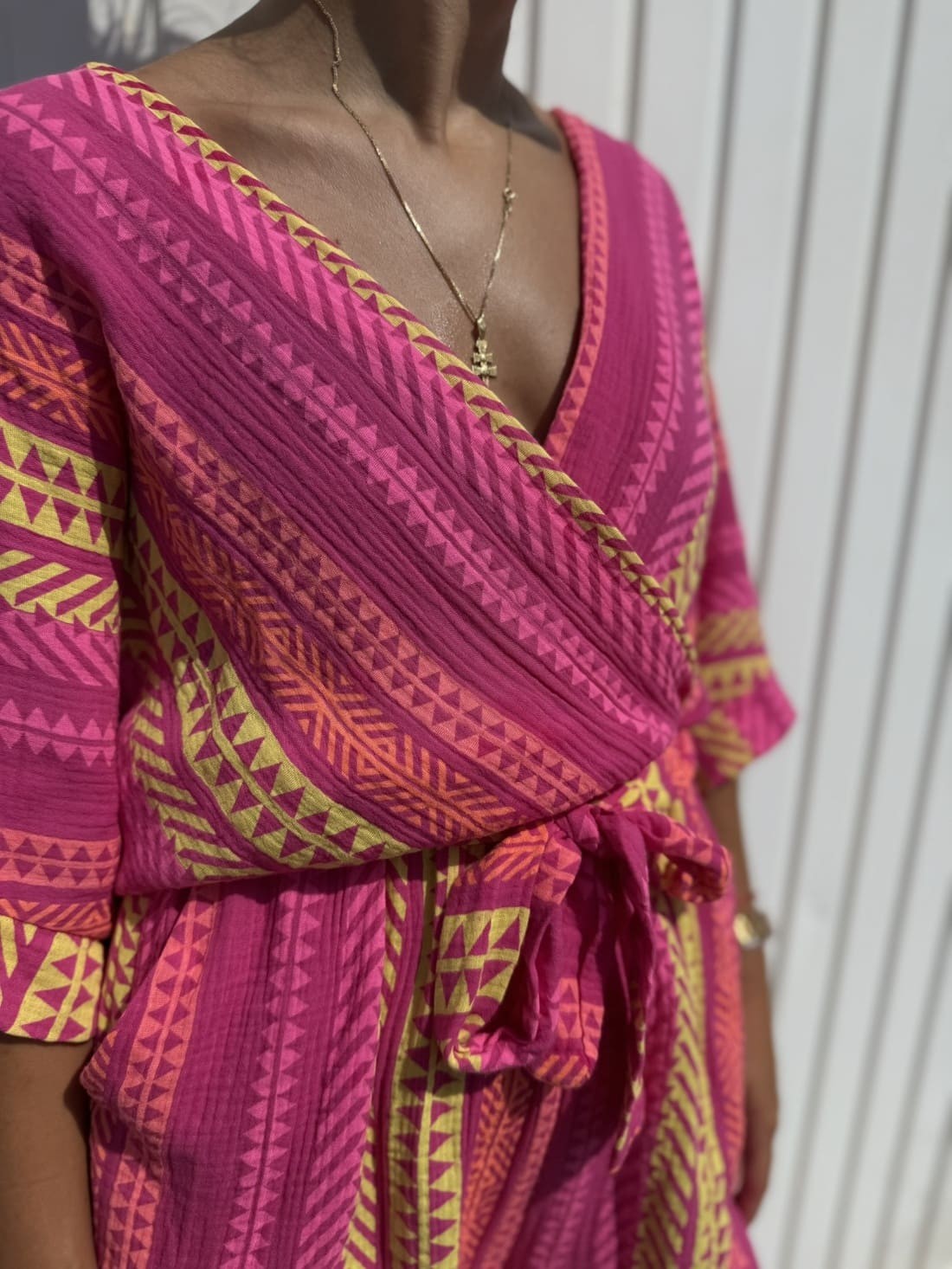 Tiene la cintura engomada y lazada para poder anudar del mismo género y color que la prenda. Es estampado en color llamativos donde predominan los rosas.