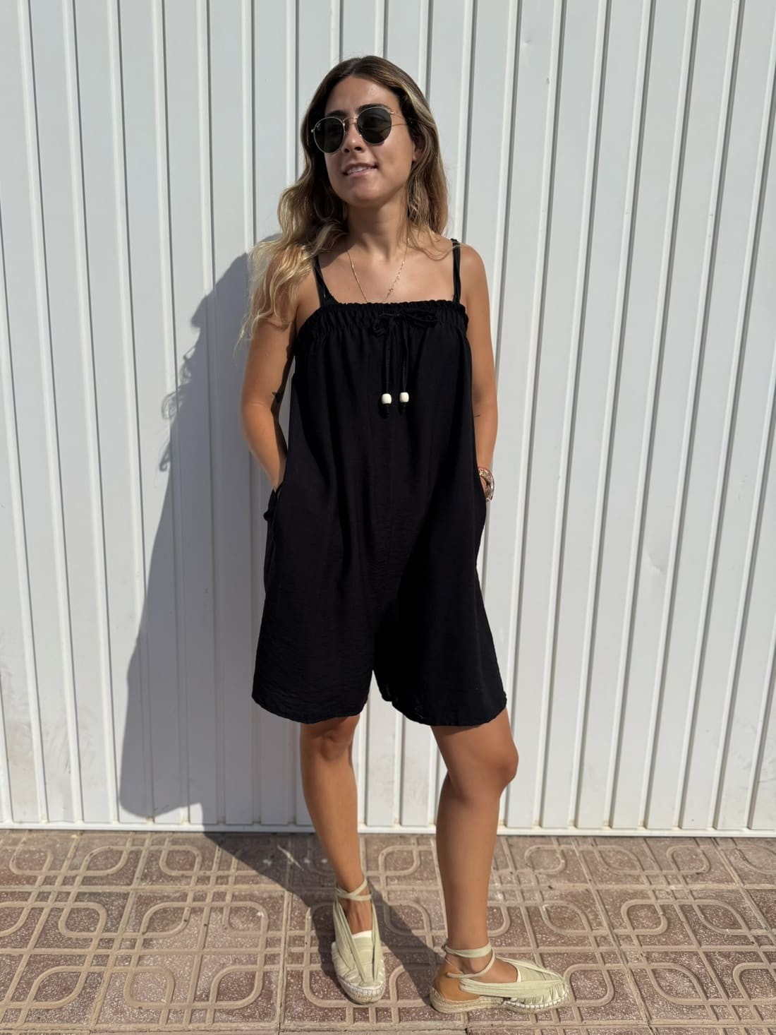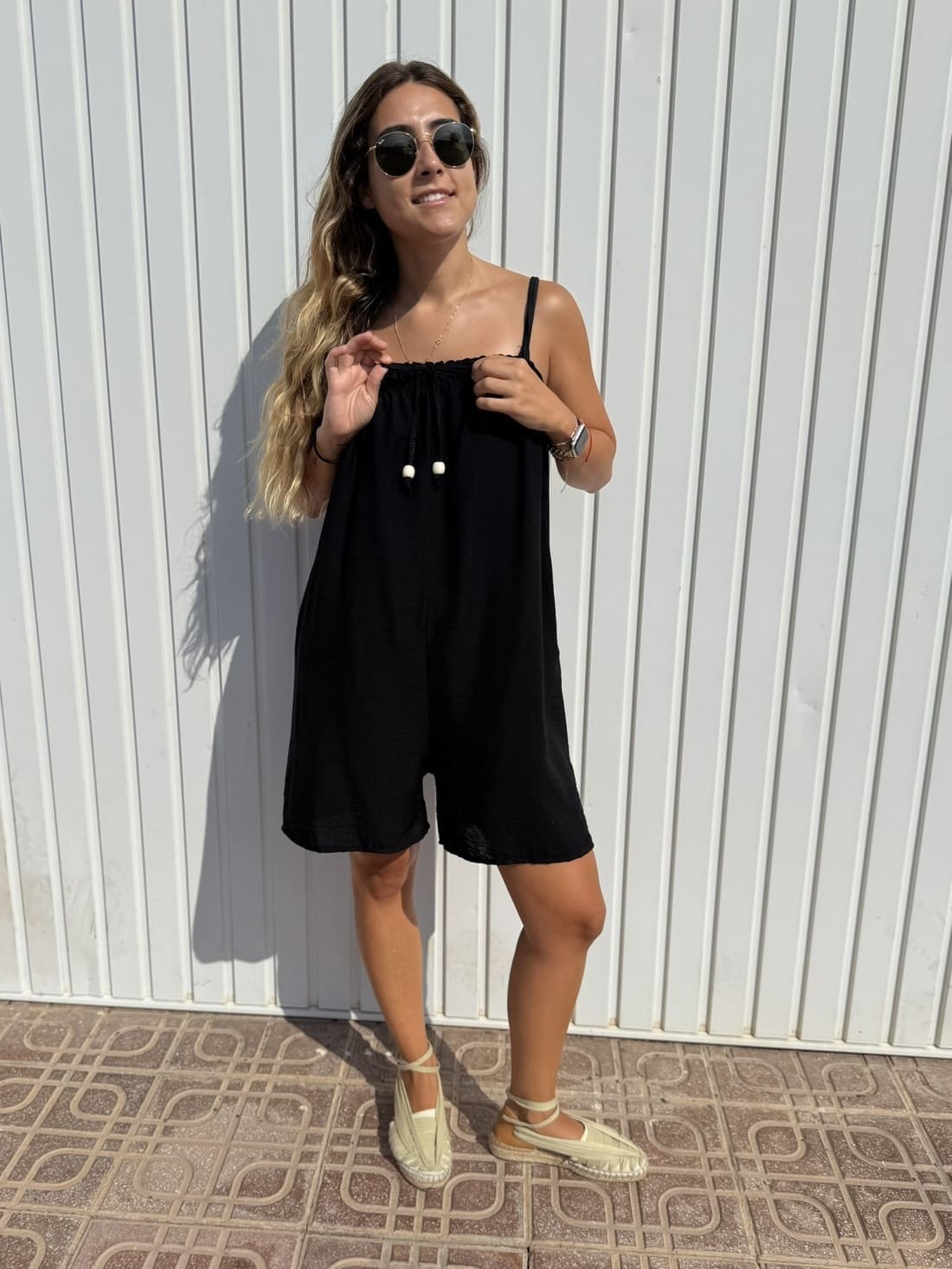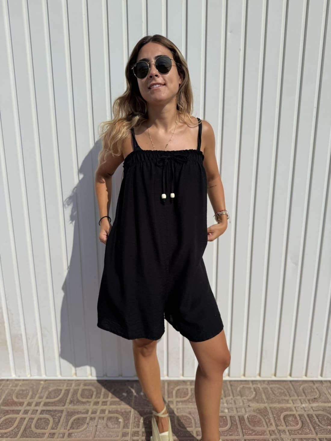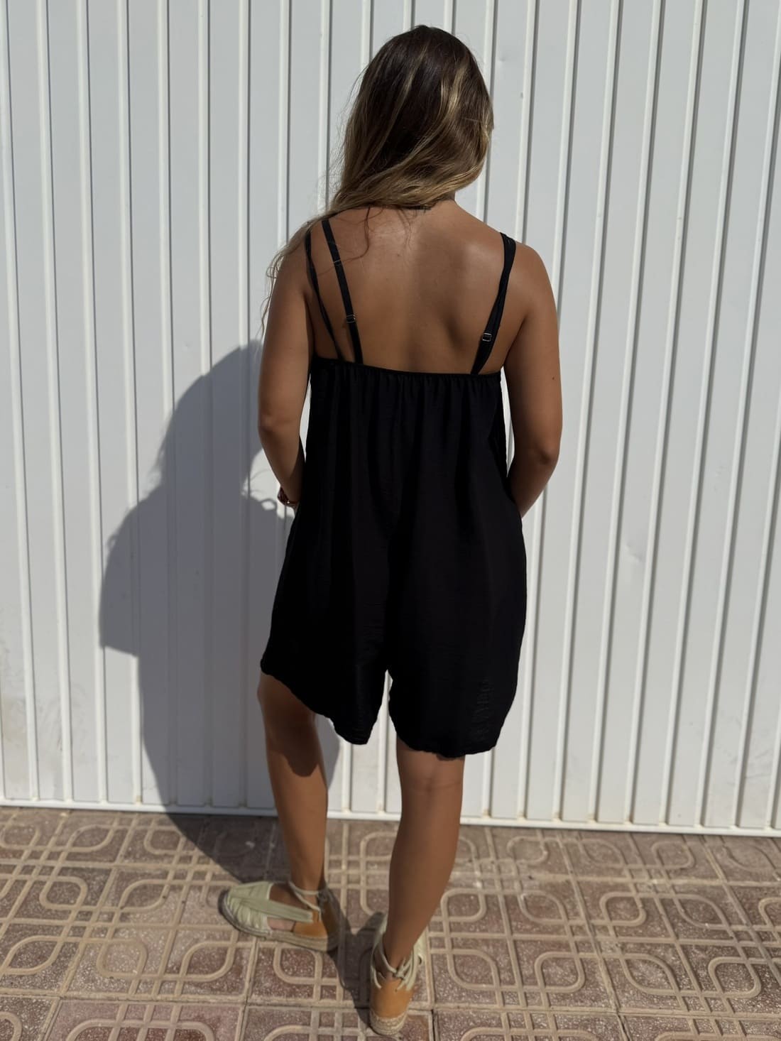 Mono corto sencillo de tirante fino con la parte de atrás engomada y con doble engomado en el pecho, quedando rizada.