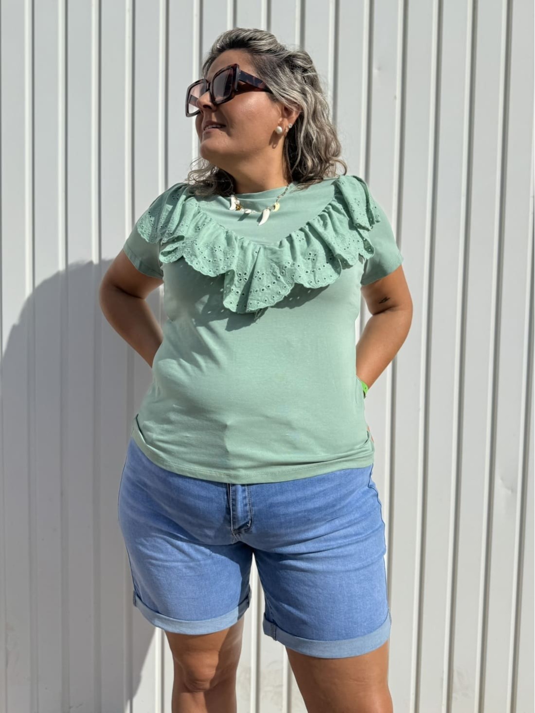 Short vaquero por encima de la rodilla con dobladillo en el bajo.
