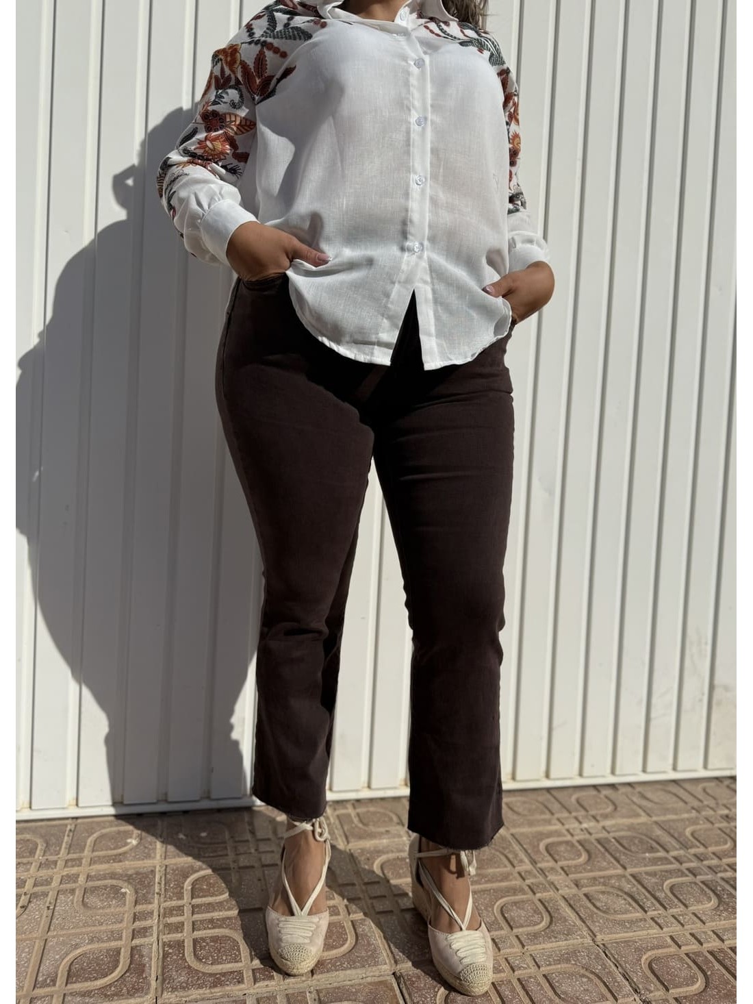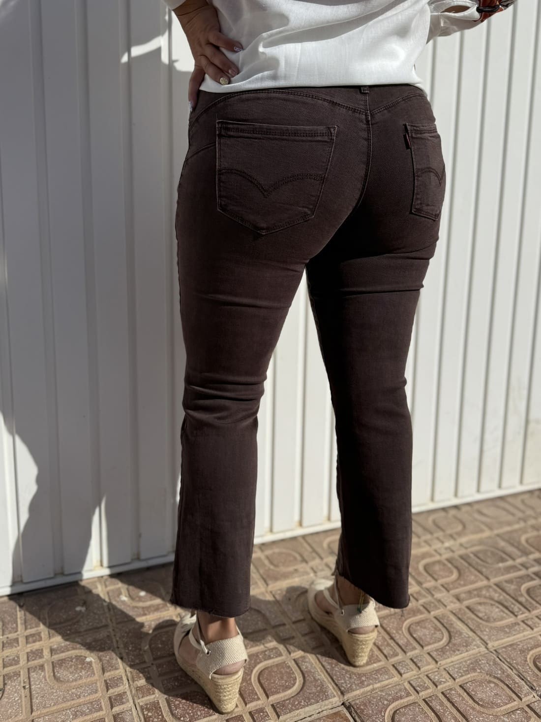 Es de color liso, un color chocolate que tanto se lleva esta temporada. Tiene el bajo deshilachado, que queda moderno y juvenil.