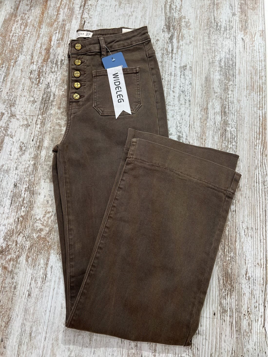 Su cierre es delantero de cinco botones dorado envejecido. El color del pantalón es un color chocolate desgastado.