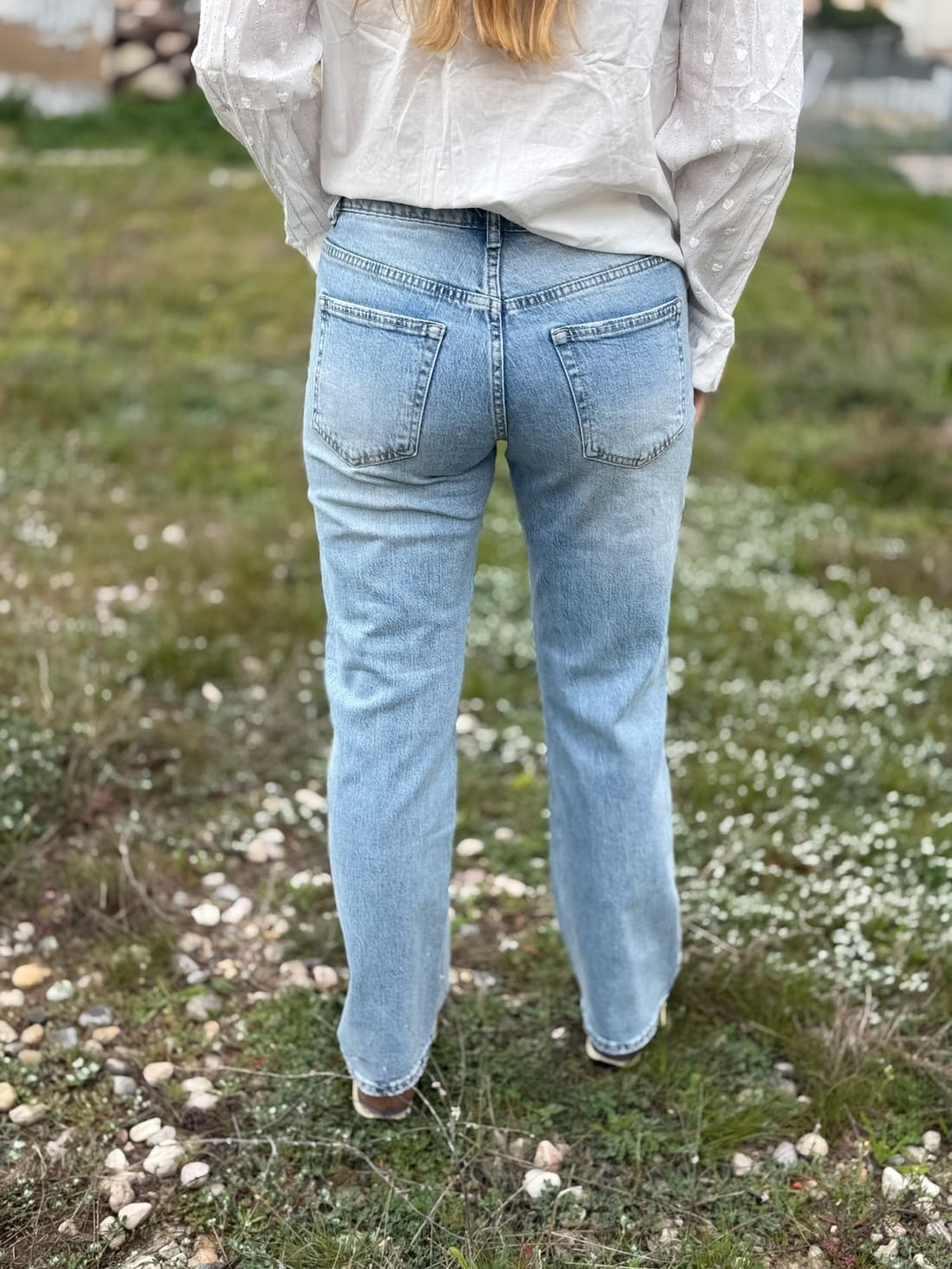 Es un pantalón que sienta muy bien de color vaquero claro con cuatro bolsillos.