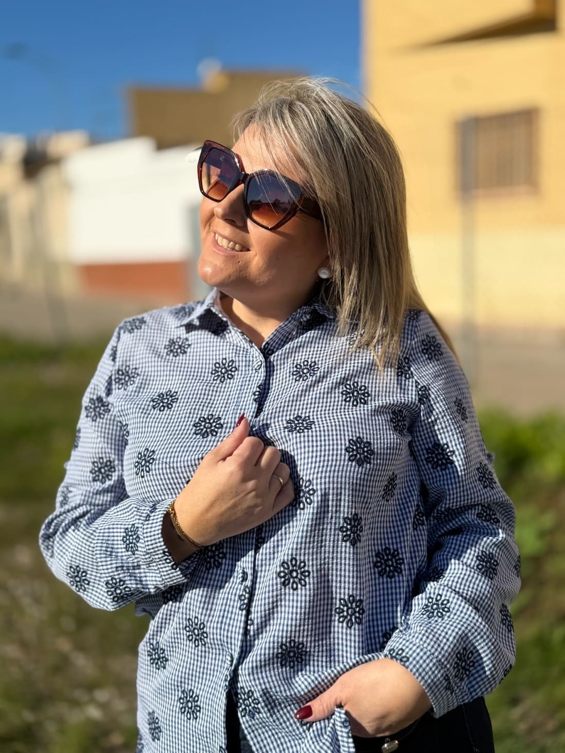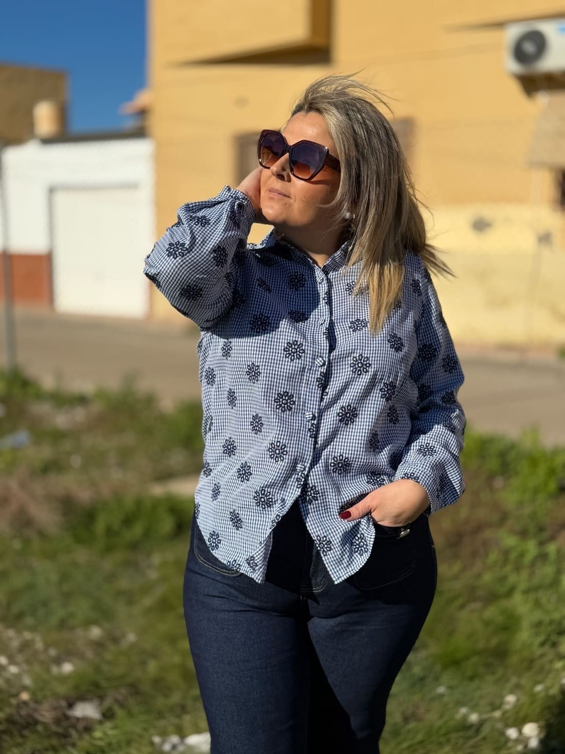 Es de cuadros pequeños con flores bordadas en azul marino. El bajo es redondeado. Es una prenda muy bonita y fácil de combinar.