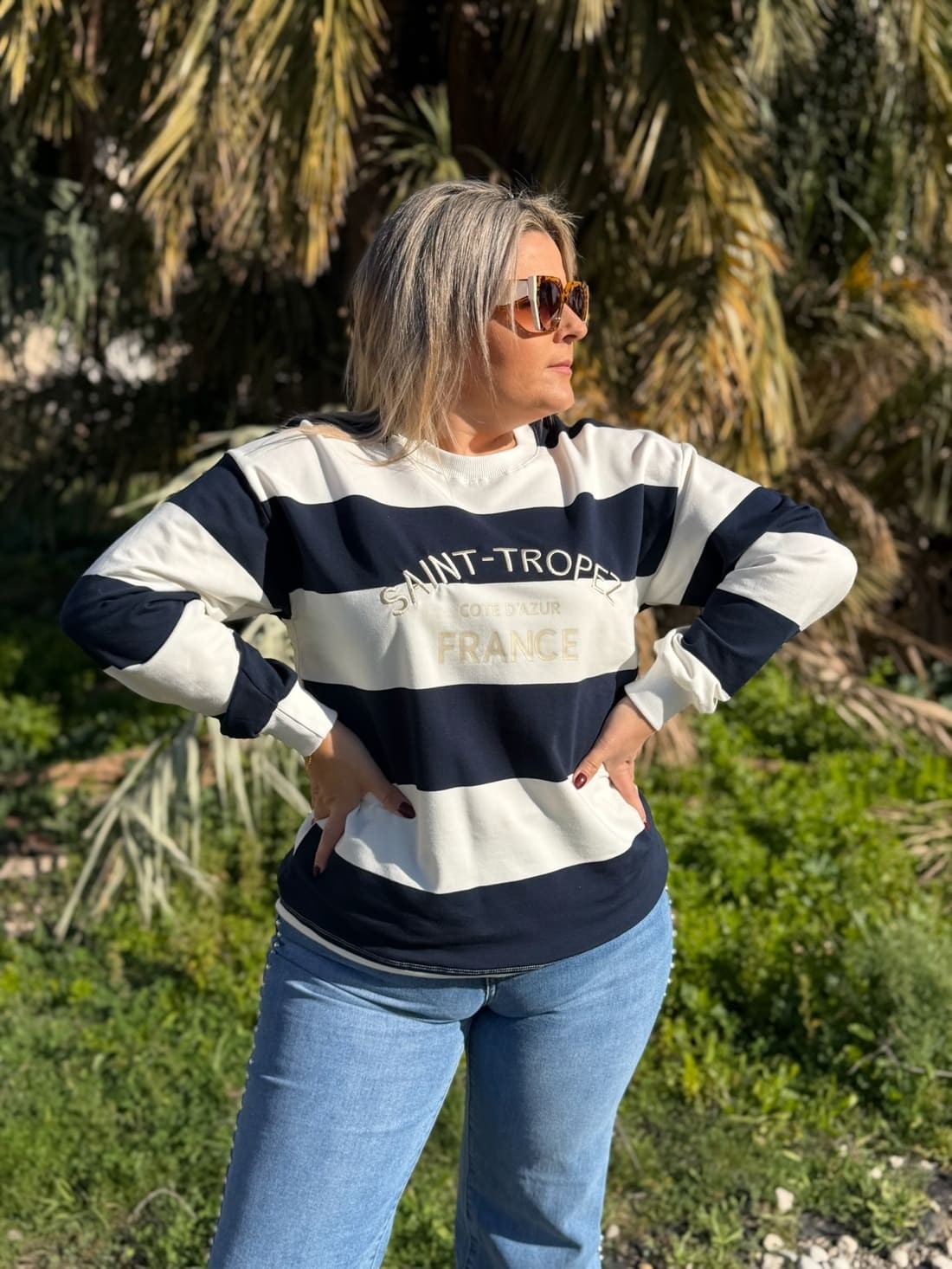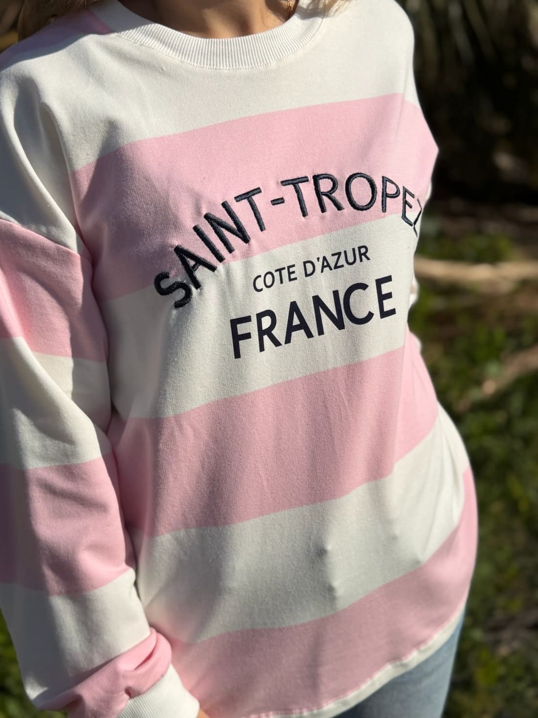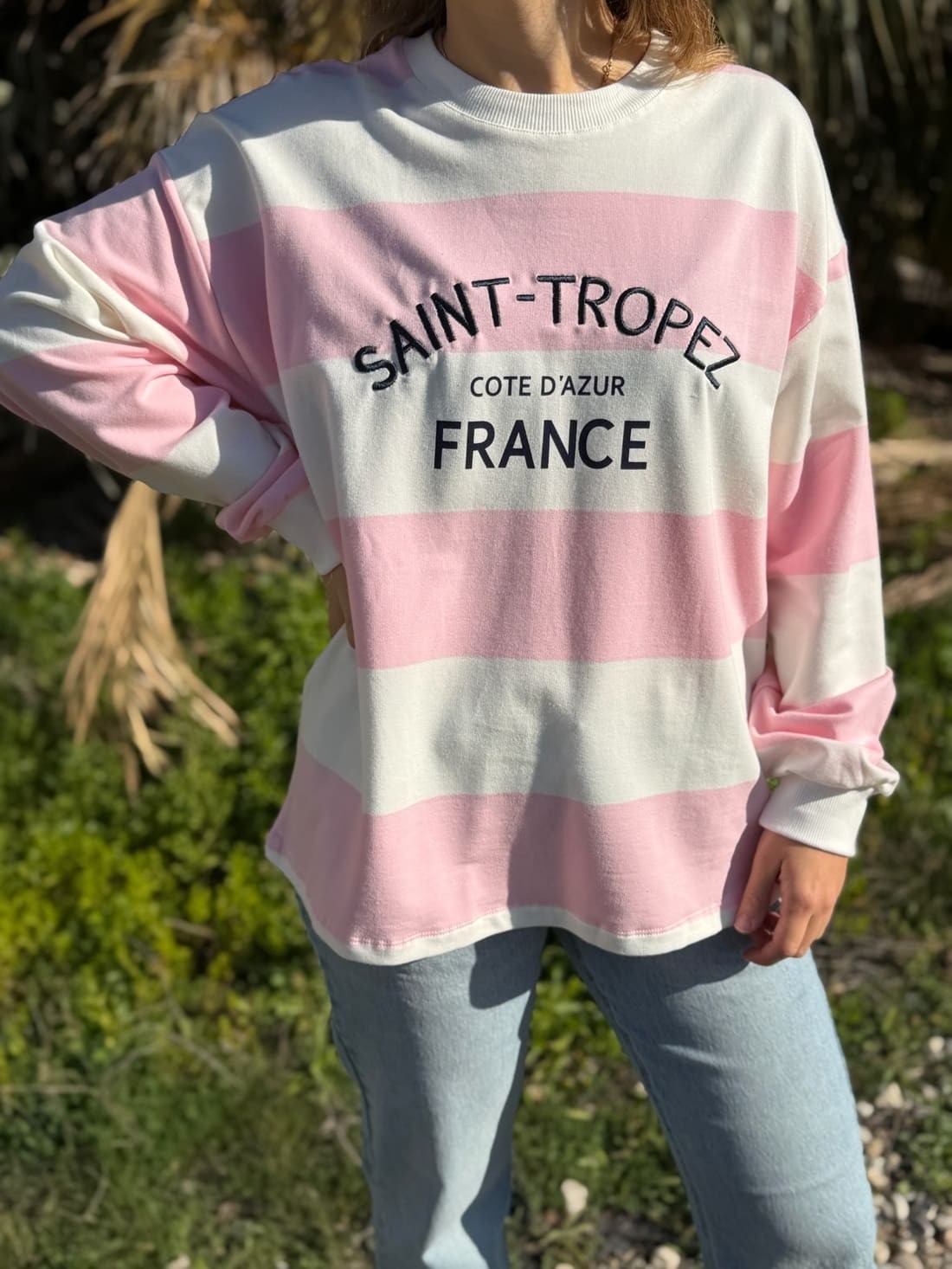 Es una sudadera de rayas horizontal con letras en el pecho, unas bordadas y otras impresas. Las tenemos disponible en varios colores.