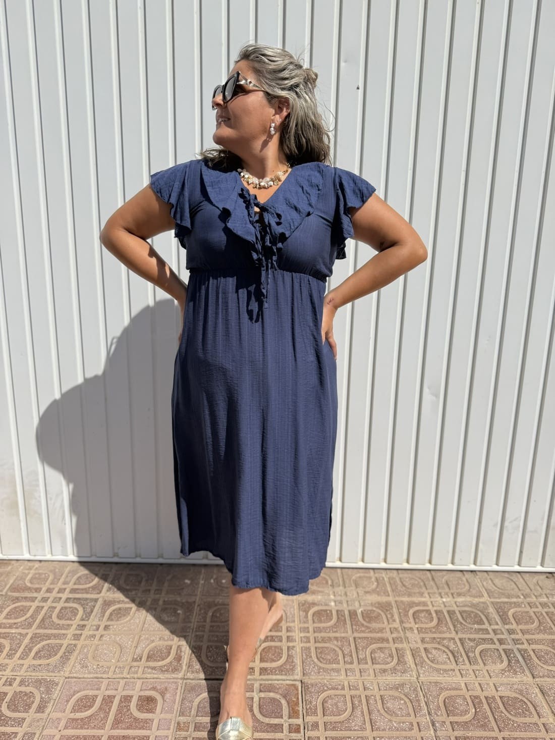 Vestido midi de manga sisa con volante del mismo género y color alrededor de esta haciendo como una corta manga.