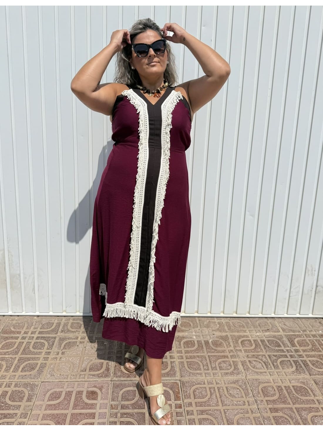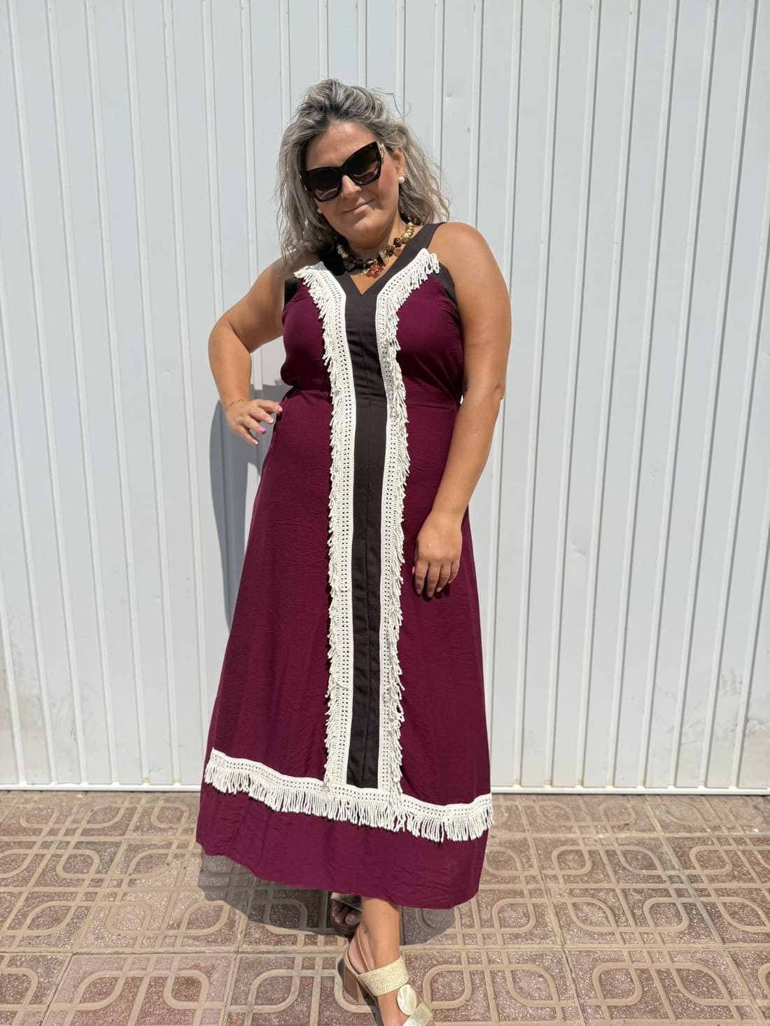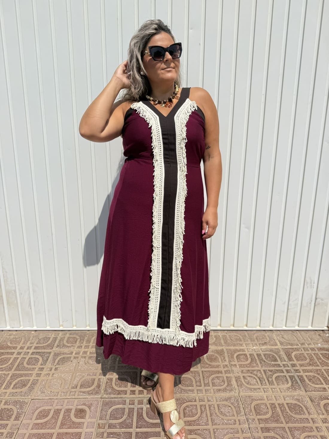 Lleva una franja del mismo color del tirante por la parte delantera con una aplicación de hilo con flecos por cada lado en color beige.