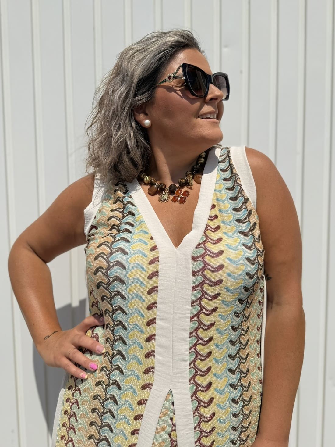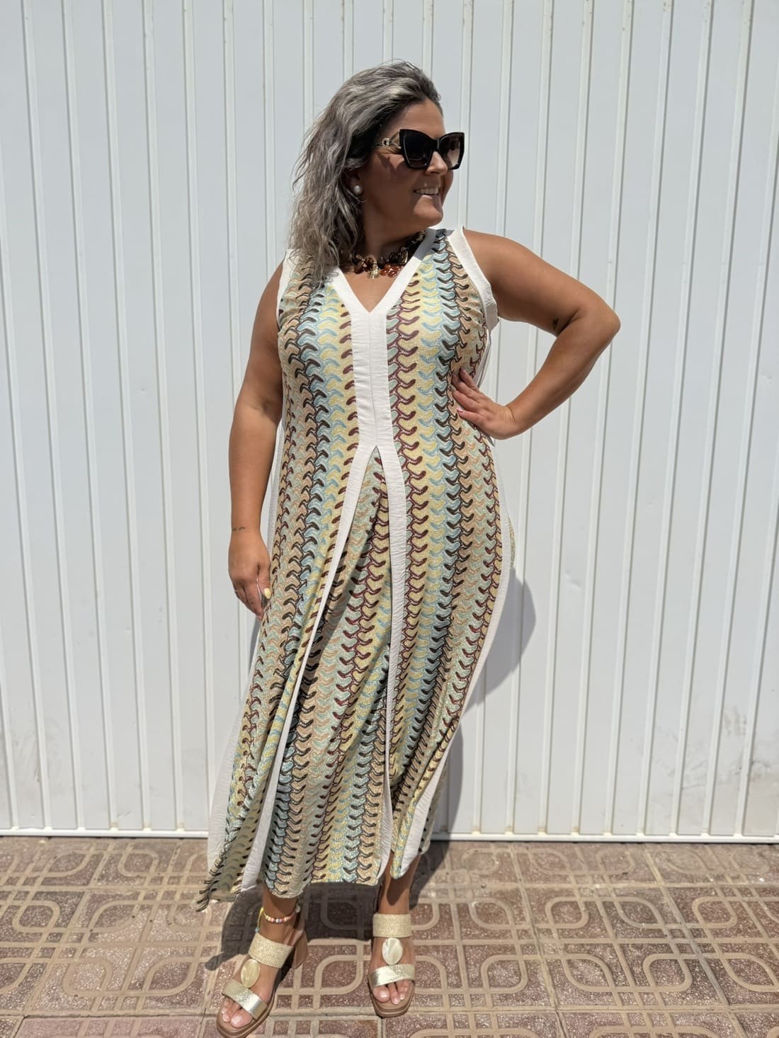 Es estampado en varios colores donde predominan los verdes y beige con brillito y con zonas en color liso beige.