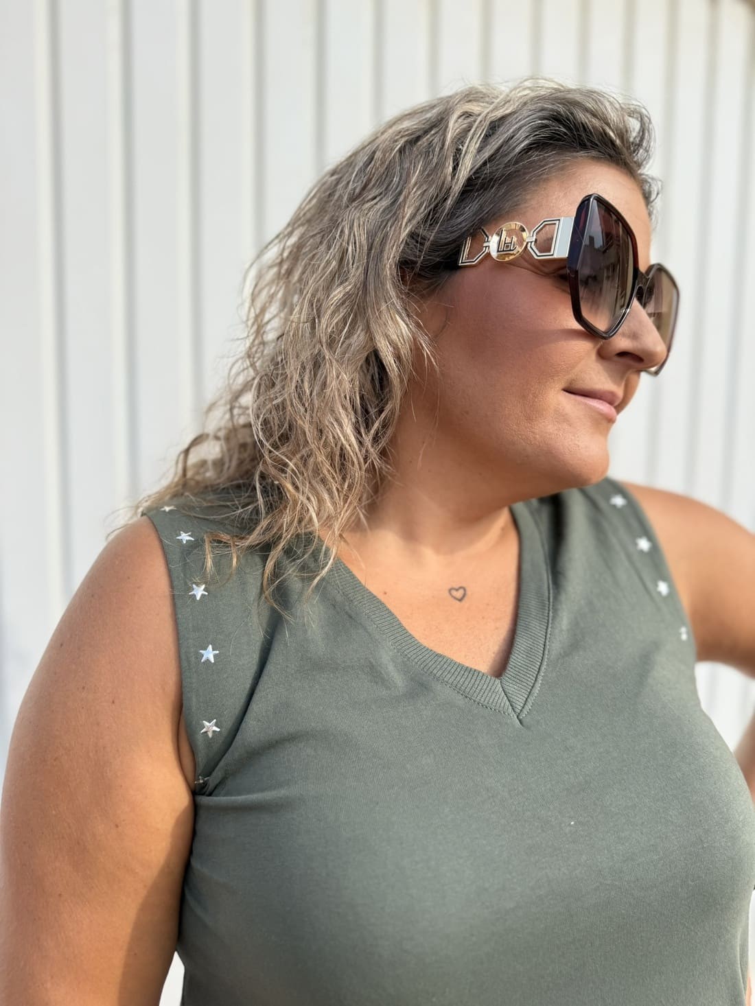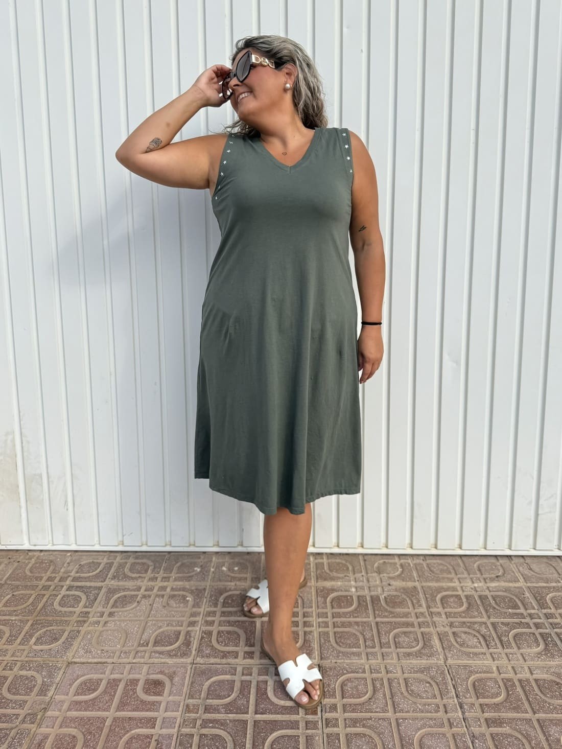 Es un vestido fresquito y cómodo con el detalle de unas tachuelas de estrellitas por la parte delantera de la sisa.